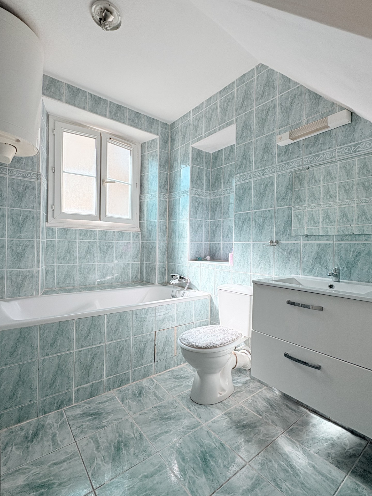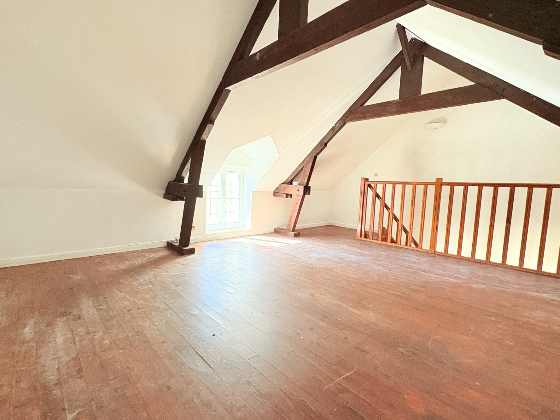 À l’étage, une chambre mansardée pleine de charme, avec poutres apparentes, créant une ambiance chaleureuse. 32.90 m2 Loi carrez et 49.84m2 au sol.