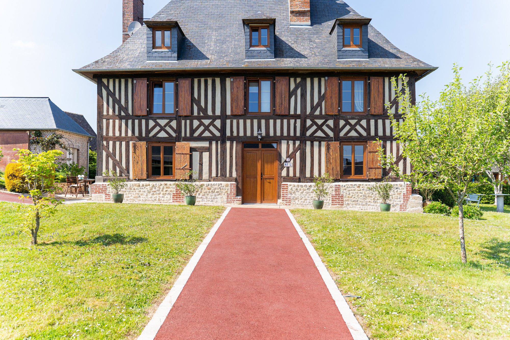 Architecture typique du Pays d’Auge : soubassement en moellons, colombages, toiture en ardoise